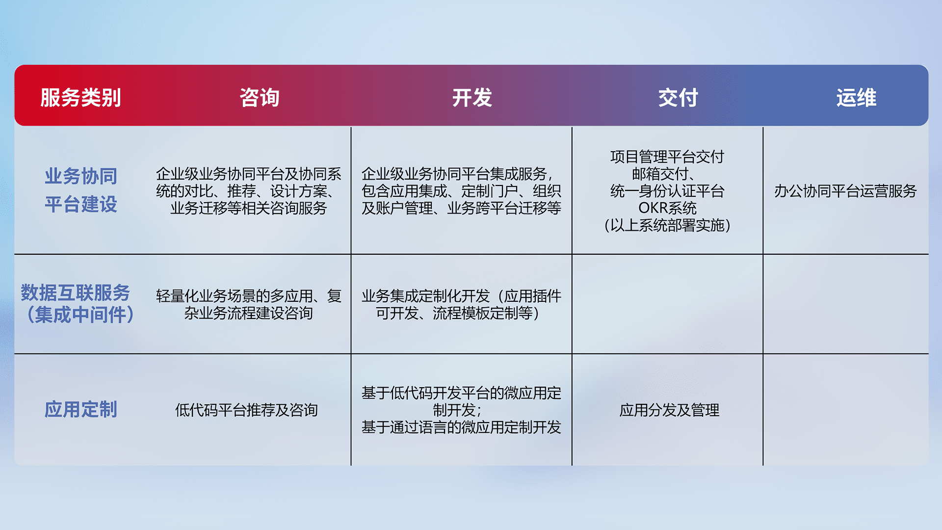 针对钉钉、、企微、、、、IDaas等平台级产品提供产品的规划、、方案、、、交付、、、定制化开发等服务,,,实现如统一协同办公、、智能客户服务、、、、混合会议管理、、智能数据查询、、等业务场景,,,实现数字化转型。。