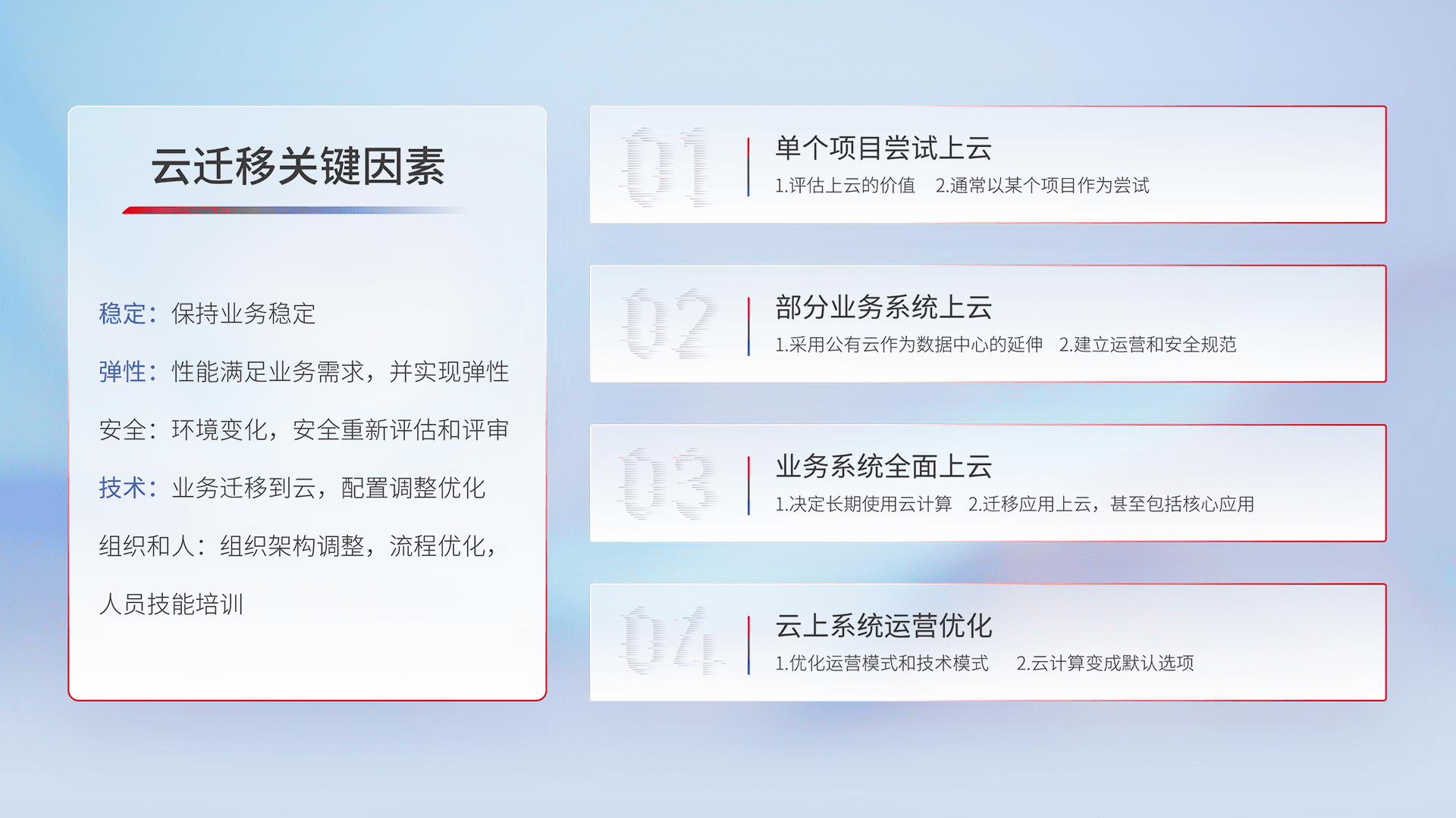 结合实际业务,,从规划设计、、云平台选型、、、云原生改造、、数据迁移、、、、集成交付,,迁移全过程为客户识别最佳上云路径,,,,做好风险识别管理,,,,设计网络架构、、、身份权限、、、安全审计合规、、操作审计、、、、日志审计、、监控告警策略、、多站点容灾设计等,,,,对云上基础设施进行整体规划,,提升IT治理水平,,,,以满足弹性、、高可用、、高性能的需求。。。